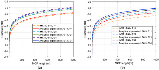 Estimation of crosstalk from the to the ) as a function of FM−MCF length (a) without stochastic perturbations and (b) with stochastic perturbation.
