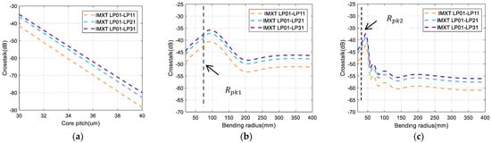 In the above study of the physical parameters of two-core fiber, we know that in the analytical expression the fiber parameters did not have a great influence on the IMXT. So, we directly studied our model subject to the core pitch and bending radius on the IMXT as shown in Figure 7. Figure 7a shows the IMXT as a function of the core pitch for our model, and it can be seen that IMXT continued to decrease as the inter-core distance increased. When the distance between the cores increased, MCCs decreased and the coupling effect between the modes decreased, resulting in a decrease in IMXT. Figure 7b,c show the IMXT as a function of the bending radius for our model in homogeneous and heterogeneous FM-MCFs. For values and , the threshold bending radius and , respectively. Simulation results of the actual homogeneous few-mode four-core fiber are shown in Figure 7a. In the phase-matching region, IMXT is proportional to the bending radius. However, in the non-phase-matching region, IMXT is inversely proportional to the bending radius. The value of the crosstalk decreased with the bending radius and tended to a stable value gradually. Next, Figure 7b illustrates the heterogeneous few-mode four-core fiber with a larger . These results show that the variation trend is basically the same as that shown in Figure 7a. The trend of these results is similar to the theoretical analysis of ICXT in MCF [19,28,29].