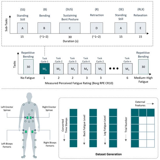 The experiment used to develop models was the same as described in detail in our previously published study [], where the complete experiment involved performing three sessions (training/session-1, session-2, session-3) with a 2-day break for muscle recovery. Participants were instructed to perform a wall-sit task for self-calibration of their perceived fatigue ratings in the legs using the Borg RPE CR-10 scale. Subsequently, maximum voluntary contractions (MVCs) were recorded from all four muscles (LES, RES, LBF, and RBF), which were used later for normalization purposes. Each of the two subsequent experimental sessions included performing bending tasks with/without the BSIE in symmetric and asymmetric postures. Participants performed tasks in both postures with and without assistance in each of the two sessions in a counterbalanced order across participants. For each experimental condition (with/without assistance and with/without asymmetry), a trial included participants performing intermittent task cycles of 30 s sustained bending, and two 15 s standing still activities with 15 s relaxation breaks until they reached a medium–high fatigue perceived exertion level on the Borg scale representing a number 7/10 (Figure 1). Repetitive trunk bending was performed at the beginning and end of each session.