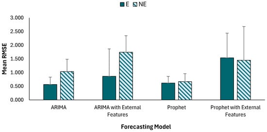 Comparison of mean Root Mean Square Error (RMSE) values for each of the developed forecasting models across with (E) assistance and without (NE) assistance conditions.