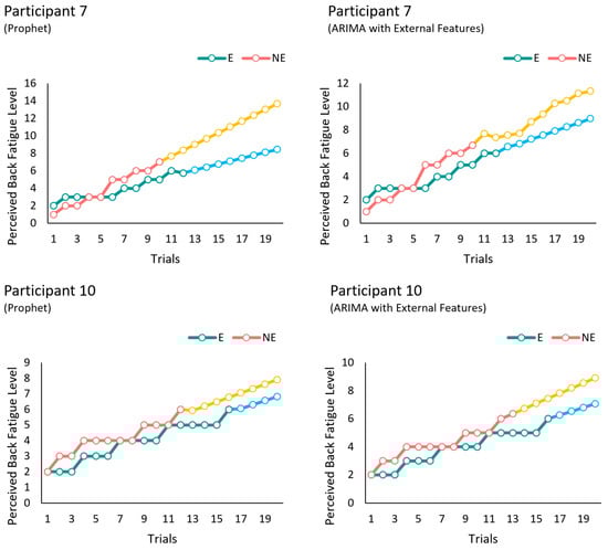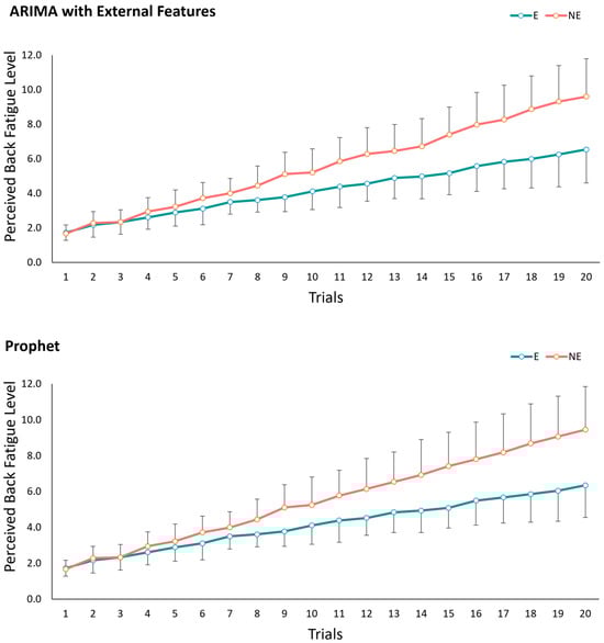 Comparison of mean values of perceived back fatigue levels across all participants for with (E) vs. without (NE) assistance conditions for best performing models of (top) ARIMA with external features and (bottom) Prophet across 20 trials with forecasting (yellow and blue colors indicate forecasted fatigue levels for without and with assistance conditions respectively).