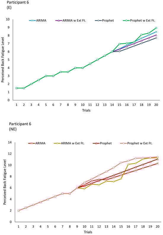 Comparison of perceived back fatigue levels across different forecasting models for (top) with denoted by E and (bottom) without assistance denoted by NE conditions for a single participant.