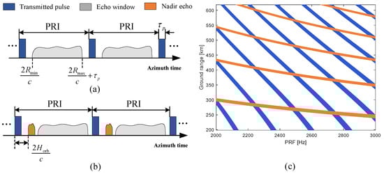 Figure 1. Schematic of echo timing constraint for spaceborne synthetic aperture radar (SAR). (a) Timing diagram of pulse transmitting and receiving to avoid transmission blockage, where the horizontal axis indicates azimuth time. (b) Timing diagram of pulse transmitting and receiving to avoid nadir echo interference. (c) Timing (diamond) diagram due to transmission blockage (blue strips) and nadir echo (orange strips) versus pulse repetition frequency (PRF).