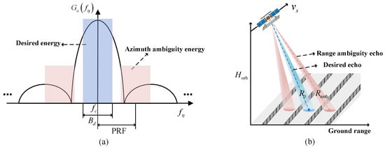 Figure 2. Schematic of ambiguity for spaceborne SAR. (a) Schematic of azimuth ambiguity, where the horizontal axis represents the Doppler frequency and the vertical axis represents the azimuth antenna pattern. (b) Schematic of range ambiguity, where the horizontal axis represents the ground range, the vertical axis represents the orbit height, the upper axis of the figure shows the direction of platform movement, and the black stripes are the blind ranges caused by the transmission blockages.