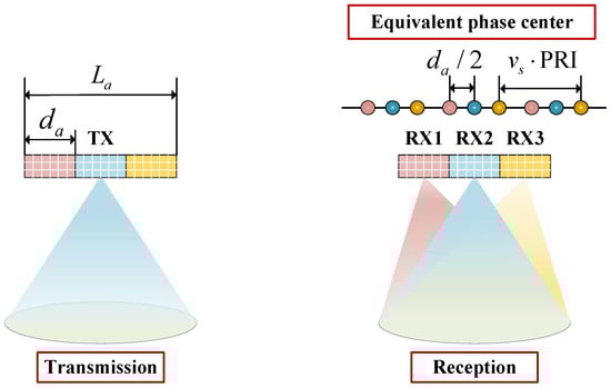 Comparison reveals that after compensating for the constant phase of the second term in (15), the echo in the ith channel is approximately equivalent to the return in (16) at d i / 2 . Taking the azimuth three-channel SAR as an example, its operation principle is shown schematically in Figure 3, where d a is the distance between neighboring channels. Obviously, for a SAR system with N a azimuth channels, N a equivalent azimuth samples can be obtained simultaneously within a single PRI.
