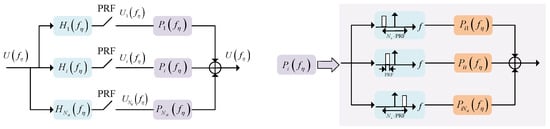 According to the generalized sampling theorem [21,22], when a signal with bandwidth B d is sampled using N a filters and each with a sampling rate not lower than B d / N a , the Doppler spectrum of the original signal can be recovered without ambiguity as long as the two samples do not overlap. Based on such a theory, Krieger et al. proposed the classical azimuth multichannel signal reconstruction algorithm without ambiguity for nonuniform sampling [20]. In this method, the reconstruction process of nonuniform sampling is regarded as the inverse process of azimuth multichannel data formation. The reconstruction filters can be derived from the transfer function of the pre-filters before data sampling. A principle schematic of this algorithm is given in Figure 4, where U f η represents the equivalent signal spectrum of single-channel SAR, f η is the Doppler frequency, and U i f η is the signal spectrum of the ith channel after pre-filtering and undersampling. The reconstruction process of the azimuth multichannel signal is to rearrange the N a signals after passing through N a reconstruction filters P i f η to obtain the oversampled single-channel signal. Comparing (15) and (16) yields the pre-filter for each channel, whose frequency domain form can be expressed as