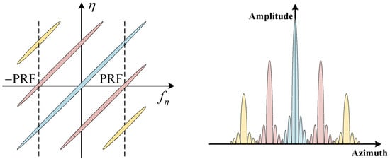 The azimuth ambiguity in SAR arises from the azimuth antenna pattern. The echo of SAR is sampled at the PRF in azimuth; thus, the azimuth signal is discrete. This requires the azimuth signal to be band-limited, with a bandwidth smaller than the PRF. However, the Doppler bandwidth of the azimuth signal is not strictly limited to B d in practice. Therefore, when sampling at the PRF, signals with Doppler frequencies that are integer multiples of the PRF in the echo will be extended into the main lobe, resulting in aliasing of the main lobe signal, which causes azimuth ambiguity in SAR. Figure 2a gives a schematic of azimuth ambiguity, where f c is the centre frequency of the signal, f η is the Doppler frequency, and G a is the azimuth antenna pattern.