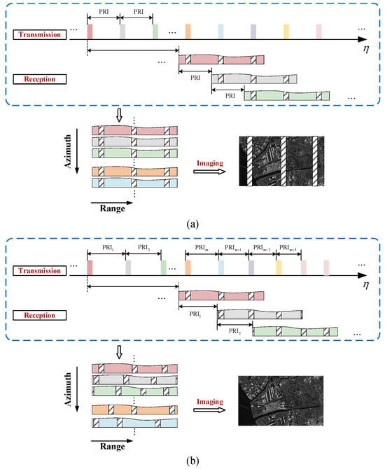 Although wide-swath SAR images can be obtained by multibeam and DBF techniques, blind ranges with fixed positions appear in the swath due to the inability to receive echoes when transmitting pulses, thus resulting in discontinuous imaging. To overcome this problem, a multiple-elevation-beam (MEB) ScanSAR mode is proposed. In this mode, multiple sub-swaths are illuminated simultaneously at a Burst time, and different pulse repetition intervals (PRIs) are selected at different Burst times to stagger the location of the blind ranges [12,13]. Following this idea of periodically varying the PRI to stagger the blind ranges, a strip mode with continuous PRI variation is proposed, where a wide beam is used to illuminate the entire swath and the continuously varied PRI is used to shift the blind ranges [14,15]. Subsequently, Villano et al. named this mode based on the PRI variation technique the staggered imaging mode, which in combination with the DBF technique in elevation can realize ultrawide continuous swath imaging without loss of azimuth resolution [16]. The PRI variation technique breaks the limitation of the pulse system and allows reception across multiple PRIs, which is a key technique for realizing high-resolution ultrawide continuous swath SAR imaging in the future.