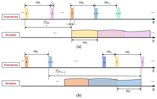 For a spaceborne SAR system using a transceiver antenna, there are typically two constraints on the echo timing. On the one hand, since the transmit and receive pulses are separated by multiple PRIs, the echo window usually needs to avoid interference from the transmitted pulse, as shown in Figure 1a. On the other hand, the nadir echo power is usually high, which can result in severe range ambiguity; thus, the nadir echo also needs to be avoided, as shown in Figure 1b. According to the timing diagram of pulse transmission and reception for the spaceborne SAR shown in Figure 1, to avoid transmission blockage and nadir echo interference, the constraints on the echo window timing can be expressed as follows: