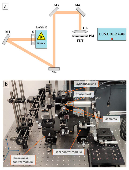 (a) The scheme and (b) photo of the setup for 1030 nm laser irradiation into optical fibers. LASER: 1030 nm fs-pulsed laser, S: shutter, M: mirrors, CL: cylindrical lens, PM: phase mask, FUT: fiber under test, LUNA OBR 4600: Rayleigh-based OFDR.