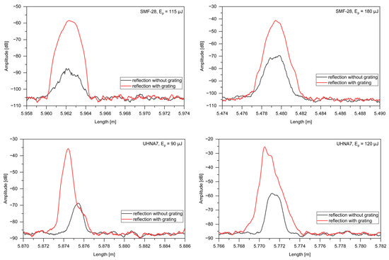 The registered amplitudes of reflected light for pulse energies of 115 μJ and 180 μJ for SMF-28 as well as 90 μJ and 120 μJ for UHNA7 with respect to full (with grating) and narrower (without grating) wavelength ranges.