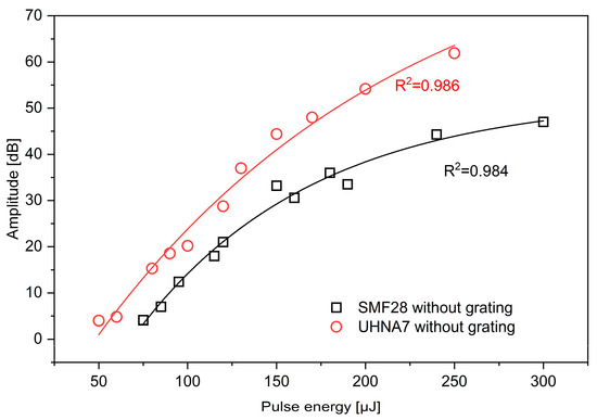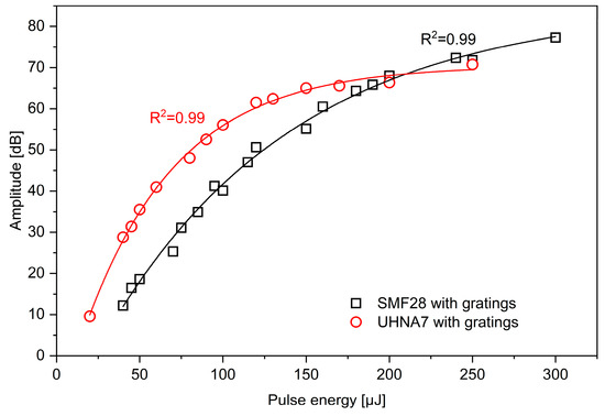 The R2 for SMF-28 and UHNA7 was 0.984 and 0.986, respectively. Based on fitting results, the output values of UHNA7 decay more slowly as a function of increasing laser pulse energy and approach a higher asymptote compared to SMF-28. The maximum enhancement of backscattered amplitude is about 61.9 dB for UHNA7 at 250 μJ and 47 dB at 300 μJ for SMF-28. The reference backscattered amplitude level (without enhancement) for the highly doped UHNA7 fiber was −87.5 dB, while for the SMF-28 fiber, a significantly lower value of −105.5 dB was observed. Thus, the enhanced amplitude was −25.6 dB for UHNA7, which is much higher than in the case of SMF-28 (−58.5 dB). To show total reflection amplitudes and the contribution of the grating, measurements were performed for the full wavelength range of the laser. Figure 4 illustrates the enhanced value of reflected amplitude involving both backscattering and grating resonance as a function of pulse energy for the investigated fibers. According to Figure 4, the amplitude changes nonlinearly in both cases. The fitting of the data shows an exponential relationship for both types of fibers (R2 = 0.994 for SMF-28 and R2 = 0.997 for UHNA7):
