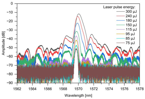 Finally, the maximum observed amplitude enhancement was 70.76 dB for UHNA7 and 77.27 dB for SMF-28. As a consequence, the highest improved amplitude was −16.74 dB for UHNA7 and −28.23 dB for SMF-28. In the case of the UHNA7 fiber, at higher laser pulse energy values, the enhanced amplitude reaches a huge level, which potentially exceeds the optimal operating range of the detector recording the backscattered amplitude, and this may cause faulty operation of the reflectometer. Therefore, the values of enhanced amplitude for the UHNA7 fiber may not be correct and may be underestimated. Furthermore, it is worth emphasizing that when irradiation was conducted with pulse energy greater than 200 μJ, damage to the phase masks was observed at the site of irradiation. The higher values obtained during these measurements and depicted in Figure 4 relate to the contribution of the reflection from the Bragg grating structure. An example of written FBGs in SMF-28, for pulse energy values from 75 μJ to 300 μJ, is shown in Figure 5. The higher the pulse energy of laser used, the greater the reflectivity and widening of the FBG spectrum obtained. The red shift of the Bragg wavelength was observed during the irradiation process, which indicates an increase in the average index change, and this is normal behavior for FBGs of Type I [21]. A shift in the Bragg wavelength towards longer wavelengths was observed in both fibers. In the case of UHNA7, compared to SMF-28, this shift was much larger and probably caused by the higher concentration of germanium in the core and its higher thermo-optic coefficient. Nevertheless, opposite to UV radiation, where hydrogen loading or photosensitive fiber is needed, herein, illumination of near-IR can be adjusted to enhance backscattering light amplitude or create a specific grating even in conventional SMF-28. The use of standard fiber has an economic advantage because of the higher cost of photosensitive fibers.