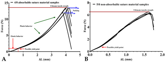 Representative superimposed tensile strength measurements stress–strain curve of different suture materials: (A): 4/0 absorbable polyglycolide-poly (e-caprolactone) copolymer suture material (Simfra, Kollsut, North Miami Beach, FL, USA) which we usually use for bowel anastomosis; (B): 5/0 non-absorbable silk suture material (Silk, SMI, Vith, Belgium) using for teaching purposes. (n = 5 per group; L0 = 8 mm; motor speed: 1.95 mm/s).