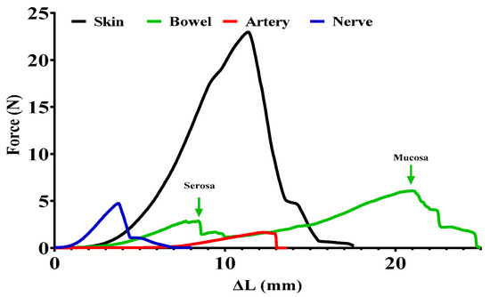 Representative tensile strength measurement stress–strain curves of different tissue biopreparates. The different mechanical properties are easily recognizable, even within a single tissue, as separate ruptures of serosa and mucosa layers (motor speed: 1.95 mm/s).