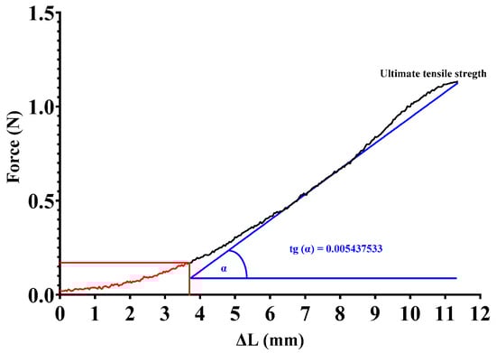Analysis of force–elongation (stress–strain) curve. The initial part of the curve (red) was not included in the slope calculation due to its irregularity (femoral artery biopreparate of a rat; L0 = 8 mm; motor speed: 1.95 mm/s).