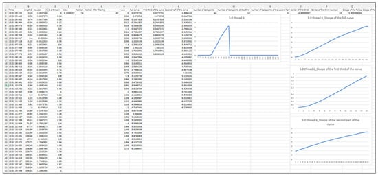 The stress–strain diagrams of various materials differ in the length of the sections between each of the notable points (proportional limit, yield point, ultimate tensile strength, breaking point). In the case of ductile materials (e.g., copper, aluminum), the elastic section (L0-yield point) dominates. For ductile materials, such as lead or even clay, the plastic section (yield-breaking point) rule. In the case of brittle materials (glass, cast iron), the “yield point” is not present and the material fractures immediately after the elastic limit [34,35]. We observed that the curves of the measurements are almost identical in each group. The two suture materials with different compositions showed different curves. The absorbable 4/0 suture showed a characteristic of elastomers (Figure 3A), while the 5/0 non-absorbable suture resembled a kind of ductile pattern (Figure 3B, Table 1). Low variance was observed up to the yield point for both graphs. Thereafter, especially for the absorbable suture, larger variations were observed. The smaller difference between the characteristics could be due to the “noise” by HX711 ADC.