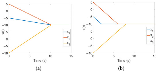 It shows that , its basic characteristic is that all states converge simultaneously, which is the most essential difference from existing FTC/FxTC and predefined time control. Simulation examples can be seen in Figure 1a,b.