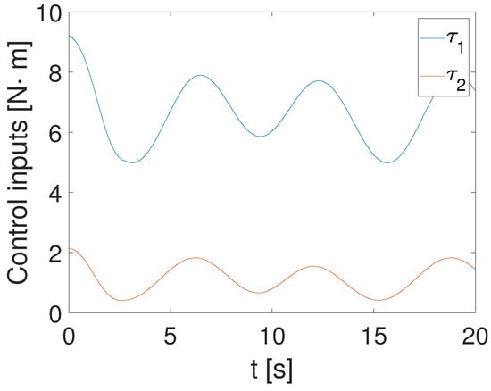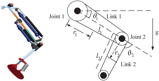 In this section, numerical simulations are conducted on a two-link knee rehabilitation robotic system, illustrated in Figure 3. , , and represent the moment of inertia, mass, and length of link i, respectively. denotes the distance between the joint to i with . For the details of the knee rehabilitation robotic system’s parameters, please refer to [30]. Here, we define . The control parameter for TS is set to . The control program runs on a computer (AMD Ryzen 5 5600H, Radeon Graphics 3.30 GHz) using Matlab 2024b.