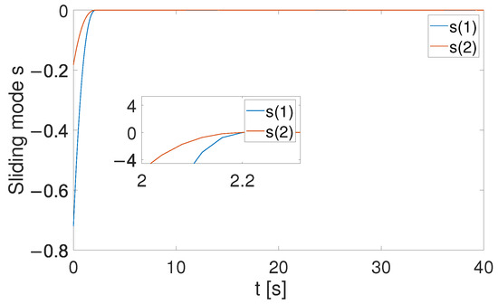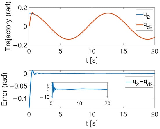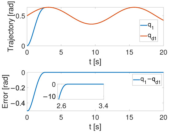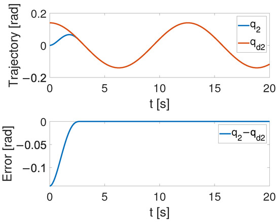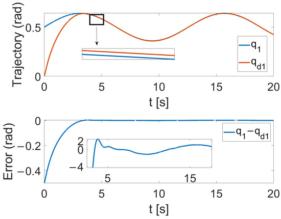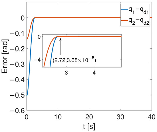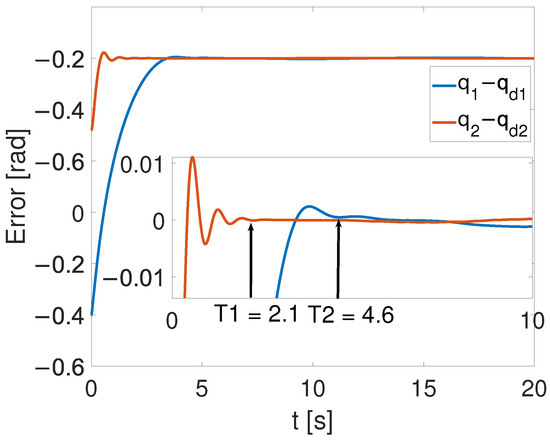 Figure 10, Figure 11 and Figure 12 show the results of the simulation. Figure 10 illustrates that, despite the achievement of the tracking task, a static error remains. In Figure 11, one can see that the overshoot phenomenon exists in the tracking curve. Furthermore, in Figure 12, the convergence times for the two joints are, respectively, s and s. By comparing Figure 6 and Figure 12, the time-synchronized convergence performance is directly proved.