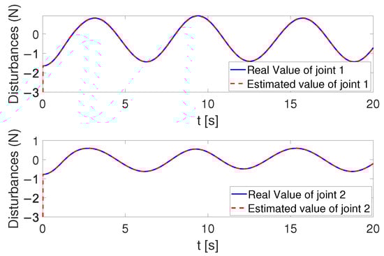Figure 4, Figure 5 and Figure 6 show that the suggested TS control is valid. Figure 4 and Figure 5 illustrate the trajectory tracking performance of the two joints. In Figure 4, it is observed that the joint follows the desired trajectory well after several seconds. Even with a large initial error value, the error converges within a few seconds under the influence of the time-synchronized control. So does the joint 2 depicted in Figure 5. Figure 6 shows that the errors of the two joints converge simultaneously at s, even though the initial errors are different. Figure 7 displays the changing of the sliding surface, revealing that of joint 1 and of joint 2 converge simultaneously at the time constant , which reflects that the sliding surface first converges, followed by the tracking error. This also demonstrates the unique characteristic of the time-synchronized convergence performance. Figure 8 is the control signal. It is obvious that there is no traditional chattering problem. Figure 9 shows the estimated and real value of the proposed observer, reflecting that after the first several seconds, the estimated value curve coincides with the actual value curve.
