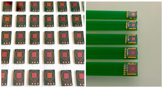 The (Pt - Pt - Ag) ElecCell devices were manufactured on 5 × 6 mm2 chips. These chips were stuck on specifically coated printed circuit boards using an epoxy insulating glue. After wire bonding, packaging was performed at the system level using a silicone glop-top in order to adapt the final device to the detection in liquid phase (Figure 2). The final pseudo-reference Ag/AgCl was formed through electrochemical oxidation of silver in potassium chloride (10−1 M) by linear sweep voltammetry from 0.1 to 0.25 V vs. SCE with a scan rate of 1 mV·s−1. This process allows the obtainment of a thin, homogeneous, and chemically stable AgCl film, ensuring a temporal drift of 0.4 mV/h in a one-day period.