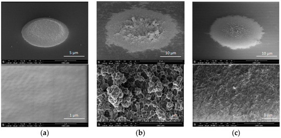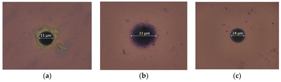The morphology of the PEDOT-based and PPy-based transducing layers was studied by optical microscopy, evidencing different configurations and structures (Figure 5 and Figure 6). In this context, it should first be mentioned that, in the frame of the SiNx wafer-level passivation process, the ultramicroelectrode (UME) radius was reduced, decreasing from its theoretical value (5 µm) to its technological one (~4 µm) [29].