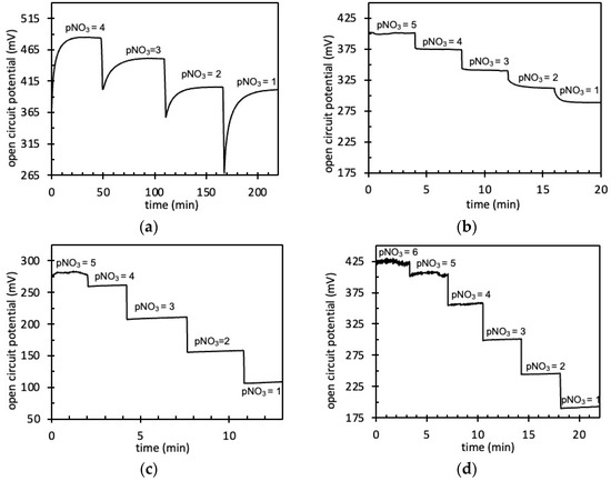 Using an Ag/AgCl/KClsaturated reference electrode from SI Analytics as well as a VMP3 potentiometer from Biologic, the different pNO3-ElecCell devices were characterized through open-circuit voltage measurements in KNO3 solutions for concentrations ranging between 10−6 and 10−1 M, aiming at the study of their detection properties (sensitivity, measurement range, and stability).
