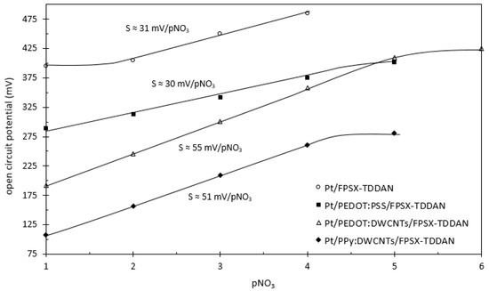 As the use of carbon nanotubes was previously proposed in order to increase double-layer capacitance [23,25,30,40,41], double-walled carbon nanotubes (DWCNTs) were added to the polymer-based electrodeposited solution, i.e., polyethylenedioxythiophene and polypyrrole (Matrixes #2 and #3, respectively). As a result, detection performances were considerably improved, evidencing very low time constants (<1 s) and quasi-Nernstian sensitivities (50–55 mV/pNO3) for both the PEDOT:DWCNT and PPy:DWCNT interfaces. Compared to the Nernst law, such lower detection sensitivities are typical of a non-ideal equilibrium at the electrolyte–membrane interface. They should be related to the physicochemical NO3−-based ion-exchanging properties of the TDDAN molecule in the FPSX structure.