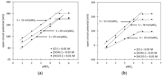Concerning selectivity, three anions associated with environmental analysis, i.e., chloride (Cl−), hydrogen carbonate (HCO3−), and sulfate (SO42−) ions, were also studied thanks to the fixed interference method (FIM; [37]) for a concentration of interfering ions of 10−2 M.