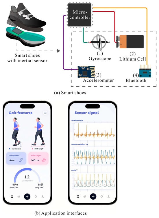 The data collection part of the hardware system was integrated with a microcomputer, Bluetooth, and an MPU-6050 sensor, including a three-axis accelerometer, a three-axis gyroscope, and other signal feedback electronic components. According to the requirements of the user manual of the sensor and Bluetooth, a 3.7V lithium battery was used to provide power for the hardware system. Additionally, we also developed application interfaces to present the analyzed gait metrics and signals, as shown in Figure 1b.