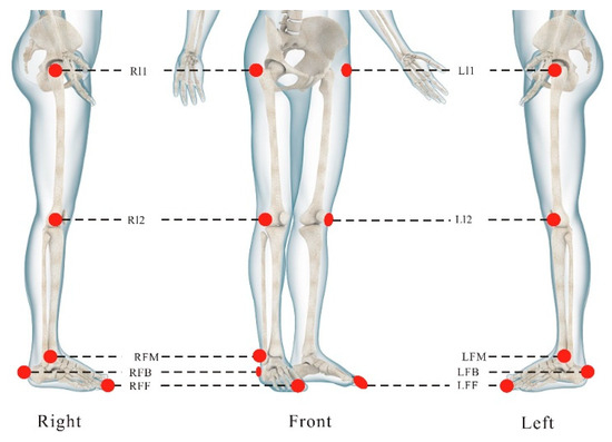 The Vicon optical motion capture system (Oxford, Oxford Metric, UK) was used in this experiment to collect the lower body motion data and evaluate the accuracy of the gait monitoring system. According to the experimental requirements and gait parameters, ten reflective markers were pasted on participants’ bodies, and the definition and illustration of the ten points are shown in Table 1 and Figure 2, respectively.