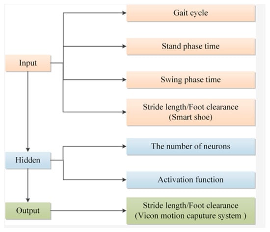 The prediction model of gait spatial parameters was built by MATLAB R2021a based on the ELM algorithm. In this study, the spatial parameters of gait include stride length and foot clearance. Due to the large difference between the two values, prediction models were established for the two gait parameters to improve the prediction accuracy of the model, as shown in Figure 4.