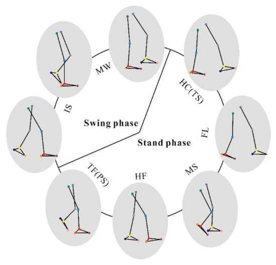 According to the human lower limb model captured by the Vicon system, the main features of the lower limb model in a complete gait cycle were intercepted by combining the RLA time phase division method, as shown in Figure 5.