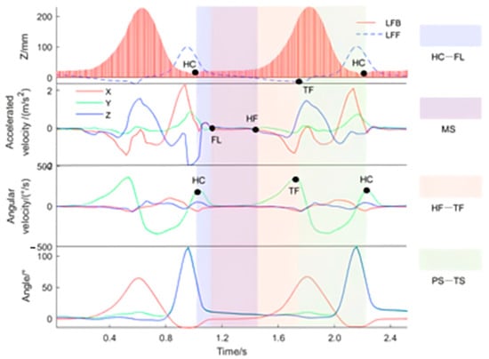 According to the motion characteristics of the feet, a complete gait can be clearly divided into four stages, which was shown as a color module in Figure 6. The first stage is from the HC event to the FL event; the characteristic points corresponding to the HC event are the lowest point of LFB in the Z-axis direction and the maximum point with a small angular velocity in the Y-axis direction. The characteristic points corresponding to the FL event are the moments when the three axial acceleration values all tend to zero. The second stage is the MS process, that is, the static state of the foot from the FL event to the HF event. The characteristic points corresponding to the HF event are the moments when the three axial acceleration values change from zero. The third stage is from the HF event to the TF event. The TF event corresponds to the lowest point of LFF in the Z-axis direction and the maximum point of angular velocity in the Y-axis direction. The first three stages all belong to the stance phase of gait. The fourth stage is the swing phase of gait, starting from the TF event to the HC event.