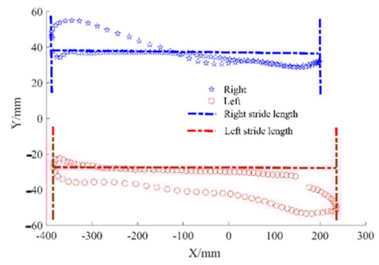 The methods of stride length extraction in the two gait measurement systems are different. The data collected by the Vicon system recorded the movement track of marker points in three-dimensional space. According to the projection of LFB and RFB on the X-Y plane, the motion characteristics of the feet can be obtained, as shown in Figure 7. Since the movement on the treadmill is relative, the feet show a back-and-forth trajectory, with the length up the X-axis representing the stride length.