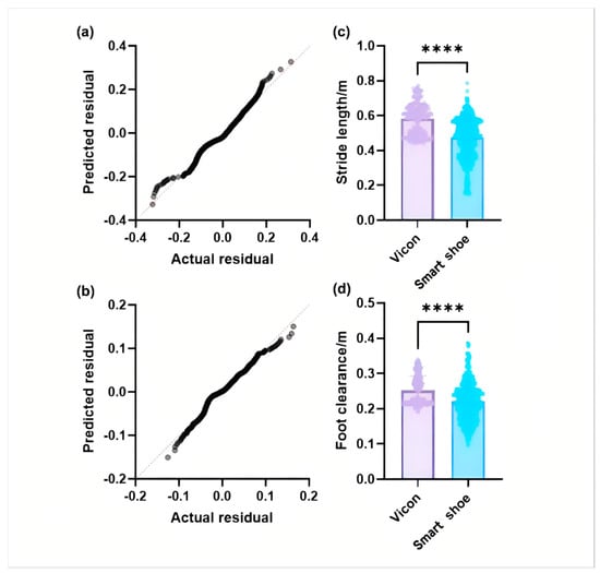 A normal distribution test and difference analysis: (a) a Q-Q plot of stride length; (b) a Q-Q plot of foot clearance; (c) the difference in stride length; (d) the difference in foot clearance. (**** in the (c,d) indicates that the p-value is less than 0.0001 and the difference between the two sets of data is very high).