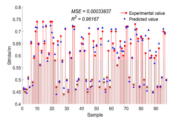 As can be seen from Figure 10, for the test set sample, the evaluation index R2 of this research model reached 96.17%, and the MSE was 0.0003. Therefore, the gait parameter prediction model based on the ELM algorithm can effectively predict the real stride length according to the gait space–time parameters detected by the gait monitoring system. By observing the numerical difference between the predicted value and the real value, it can be found that the predicted value of stride length is mostly larger than the real value.