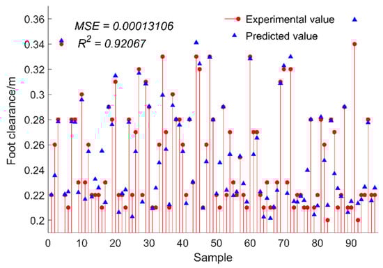 As can be seen from Figure 10, the R2 value of the test set sample is 92.07% in terms of foot clearance, 4.10% less than the stride length. However, the MSE of this model is 0.0001, so the ELM algorithm also has a good predicted effect on foot clearance. Contrary to the stride length, the predicted value of foot clearance is less than the real value.