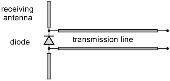 A typical dipole–diode probe for E-field measurement is presented in Figure 1. Generally, such a probe consists of a receiving antenna, a diode, and a transmission line.