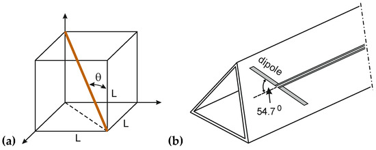 Another popular solution allowing the obtaining of an effective isotropic probe is to arrange three dipoles in the form of an equilateral triangle, with the angle being called a “magic angle.” The geometry of the magic angle and the schematic structure of the resulting omnidirectional antenna system are presented in Figure 3.