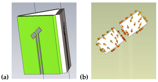 A polarization type of antenna depends on the current function. This brings about a situation wherein the current within the simple shortened dipole is not oriented with the magic angle (Figure 4b); hence, an antenna system composed of three such dipoles cannot form an isotropic antenna pattern. To obtain the desired current direction in the dipole, there is a need to minimize the coupling effect with the transmission line. The proposed design of the dipole realizing this coupling minimization is presented in Figure 5a.