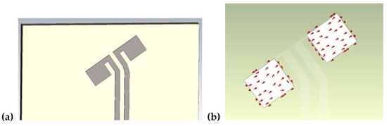 In the modified dipole design, the arms are connected with the feeding line by a narrow wire placed at the upper part of the dipole part. In this configuration, the current flows along the magic angle on both arms—as demonstrated in Figure 5b. Such a dipole shape with current flowing along the magic angle was adopted to construct the isotropic antenna system.