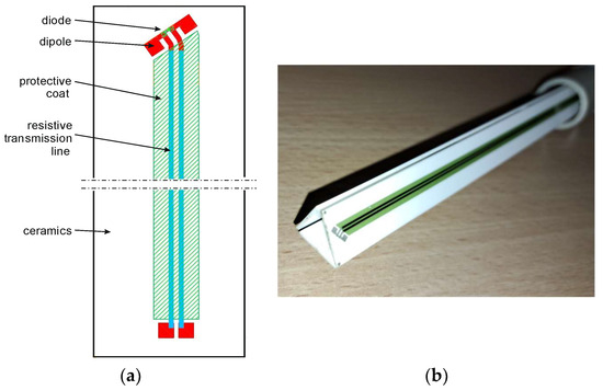 Utilizing the modified antenna shape, we fabricated an antenna system arrangement of three dipoles in an equilateral triangle configuration. The probe consists of three segments (Figure 6b). The single segment, presented in Figure 6a, is composed of a detection part (dipole and diode) and a resistive transmission line covered by a protective coat and ceramics.
