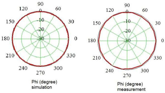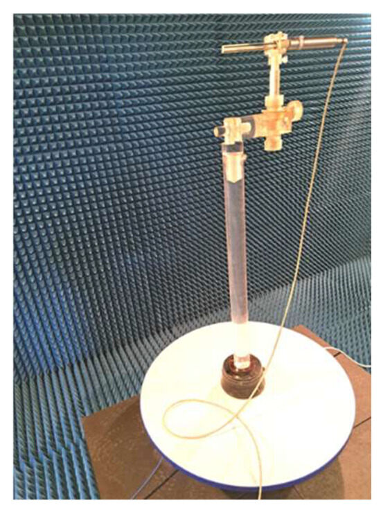 In the verification of probe isotropic ability, both computer simulation and measurement were applied. Simulation was performed using CST Studio, and measurement was executed in an anechoic chamber (Figure 8). The probe was installed in a turntable with the vertical rotation axis passing through the dipoles. This guarantees the same phase of the incident field to the antenna system for all turning angles.