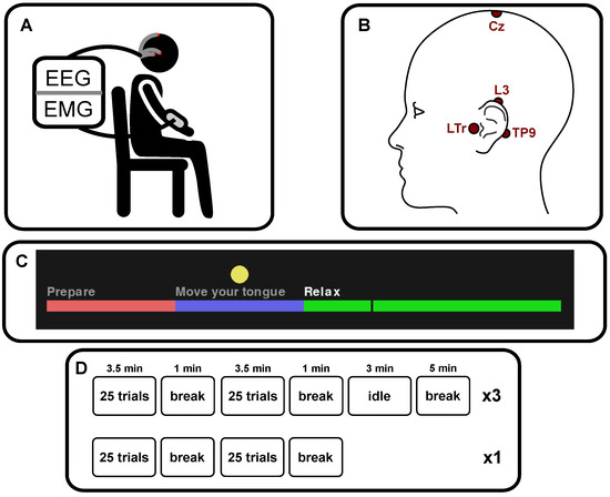 The experiment followed a counter-balanced within-subject design, divided into four blocks per experimental condition (tongue or hand movement), each containing 25 movement trials, with experimental condition movement changing after every 50th trial (see Figure 2D). Before the first tongue block, subjects received instructions that they should move the tip of their tongue from the rest position to touch their upper palate behind their teeth and keep the position for two seconds before returning to the rest position. The movement should be ballistic and with minimal force to avoid fatigue. One subject reported that the target position was the tongue’s rest position, but in this case, the instruction was to move the tongue backward on the palate instead. Before the first hand block, subjects were instructed on how to perform fast wrist extensions. The wrist extension was ballistic with minimal force. The wrist extension was then kept for two seconds before returning to the rest position. While performing the tongue and hand movements, the subjects were asked to sit as still as possible to avoid movement artifacts, blinking, and swallowing during the preparation and movement phase (see Figure 2C). Subjects performed a single test trial before each block, reminding them of the trial phases and the target movement, but this test trial was omitted in the analysis. Three 3-min long idle activity blocks were recorded too to ensure that there were enough data to extract the same number of epochs as for the movement classes [31] (see Figure 2D), and before each of them, subjects were instructed to sit relaxed with their eyes open.