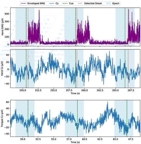 Epoch extraction visualized on three example epochs. Hand epochs are extracted using the EMG recorded from wrist extension (top panel). The hand movements are not timed precisely at the cue and the figure shows that onset detection is robust against the delay variation. The corresponding single-trial EEG is shown on the middle panel. Tongue epochs are extracted solely from the timing of the cues (bottom panel).