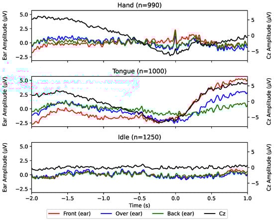 Grand epoch averages for each channel and condition across all subjects, centered () around movement onset (hand) or cue (tongue). n designates the number of averaged epochs. Ear-EEG channels and Cz channels are scaled differently in order to showcase the morphology more clearly. The vertical dotted lines denote the timing of negative peaks for each channel, labeled in seconds relative to the movement onset ().