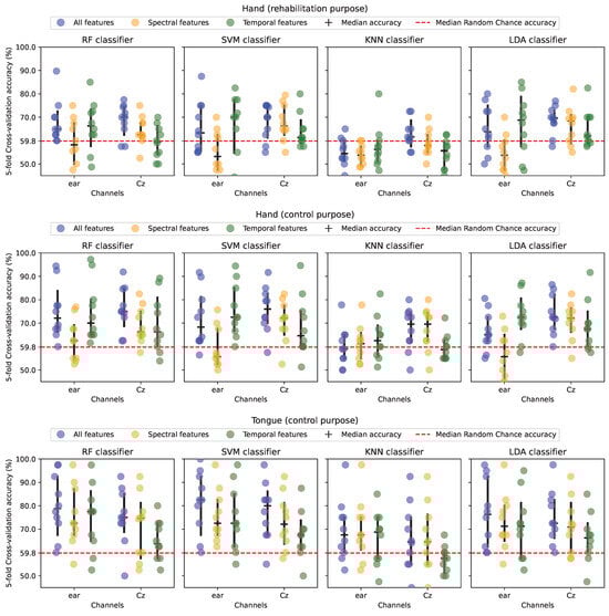 As summarized in Figure 5 and Table 2 it can be seen that the highest classification accuracies are generally obtained when using all features compared to spectral and temporal features alone. However, the statistical analysis revealed no significant effect of feature type on the classification accuracies (F(1.1,10.1) = 4.5; ). The performance was very similar when using RF, SVM, and LDA, but the performance decreased significantly for KNN compared to the three other classifiers (F(3,27) = 46.6; ). The classification accuracies obtained for control purposes were approximately 5–20 percentage points higher compared to those obtained for rehabilitation purposes with tongue movements having higher classification accuracies compared to hand movements. The difference in classification accuracies between the control scenarios and rehabilitation scenarios was statistically significant (F(1.3,11.5) = 6.2; ). The median classification accuracies were significantly above the chance level for the vast majority of the combinations, and those that were below the chance level were primarily associated with classification performed with KNN. It should be noted that there is a considerable variation in the classification accuracies across participants. The classification accuracies obtained from around-ear EEG channels were similar to those obtained from Cz (F(1,9) = 0.1; ). There was a significant interaction between electrode location and purpose (F(2,18) = 6.7; ) where Cz was associated with higher classification accuracies in the two scenarios involving the hand (rehabilitation and control purpose), while around-ear EEG was associated with the highest accuracies for the control purpose using the tongue. Moreover, there was a significant interaction between the electrode location and feature type (F(1.2,10.9) = 11.9; ) where Cz was associated with higher classification accuracies when using temporal features, and around-ear EEG was associated with the highest accuracies when using spectral features.