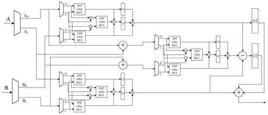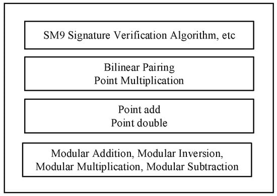 As shown in Figure 1, the SM9 algorithm can be divided into four levels in terms of functionality and complexity. The first level is the SM9 protocol layer, which includes the signature algorithm, key exchange protocol, and others. The second level consists of bilinear pairing and point multiplication, which are more complex functional components based on elliptic curve operations. The bilinear pairing operation rules are quite special and can be referenced in []. The first level achieves its functionality by invoking these components. The third level includes point addition and point double, which are the basic elliptic curve operations. The fourth level comprises modular addition, modular inversion, modular multiplication, and modular subtraction over finite fields [].